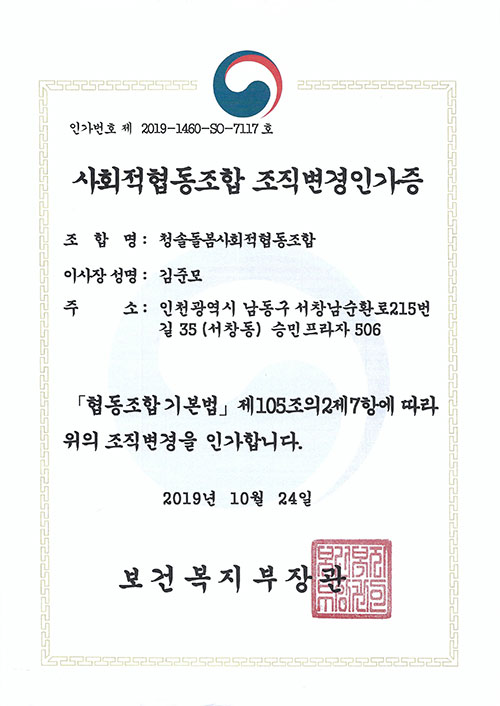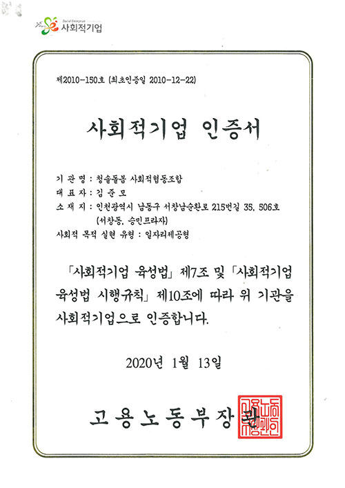 저소득층의 자활ㆍ자립을 지원하는 사회복지시설 인천남동지역자활센터에서 오랜 기간 사회서비스사업을 통해 다져진 경험을 바탕으로 만든 청솔돌봄 사회적협동조합은 일하는 이들에게는 좀 더 나은 일자리를 제공하고 돌봄이 필요한 분들에게는 보다 나은 보살핌을 제공하기 위해 설립하였습니다.
